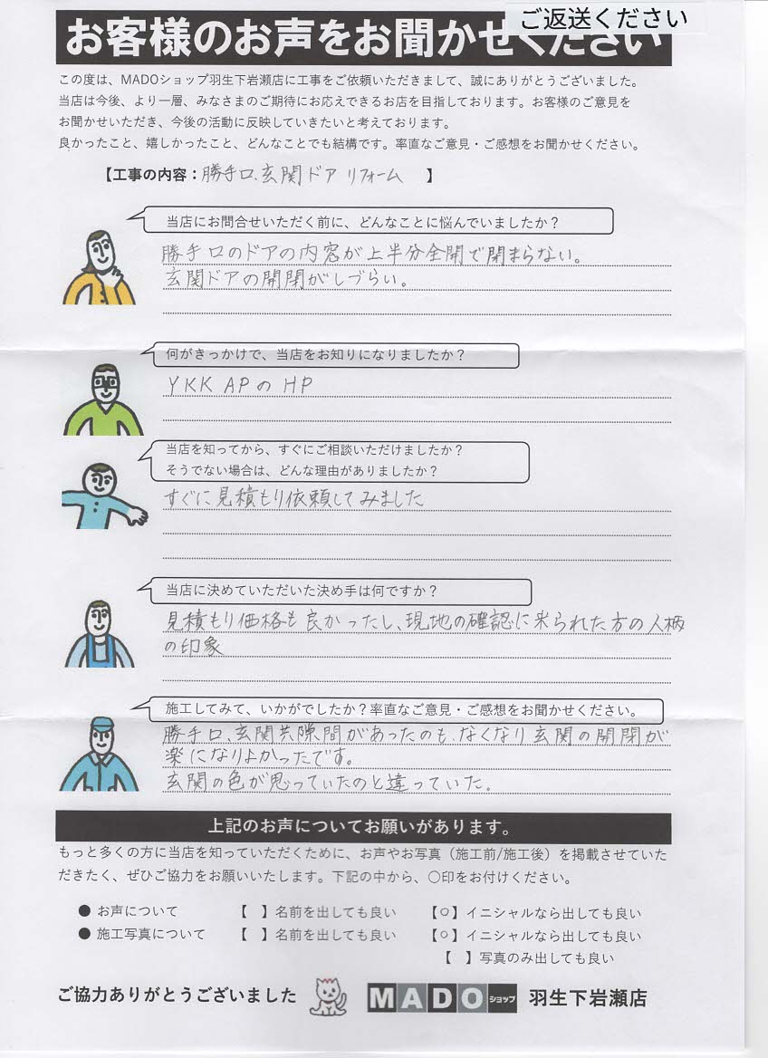 【群馬県明和町】玄関ドア & 勝手口ドア同時リフォーム|開閉のストレスから解放され、毎日が快適に✨ たった1日で快適さが劇的に変わる、カバー工法による玄関・勝手口ドア交換の施工事例です。 工事の内容 玄関交換 勝手口ドア交換 お悩み 勝手口ドアの内窓が上半分全開で閉まらない。 玄関ドアの開閉がしづらい。 何がきっかけで、当店をお知りになりましたか? YKKAPのHP 当店に決めた決め手 見積もり価格も良かったし、現地の確認に来られた方の人柄の印象。 施工してみて、いかがでしたか?率直なご意見・ご感想をおきかせください。 勝手口、玄関とも隙間があったのもなくなり、 玄関の開閉が楽になりよかったです。 ORDER このお客様の施工内容 たった1日で快適さが劇的に変わる、カバー工法による玄関・勝手口ドア交換の施工事例です。 玄関ドア勝手口 前の記事 次の記事 一覧へ戻る
